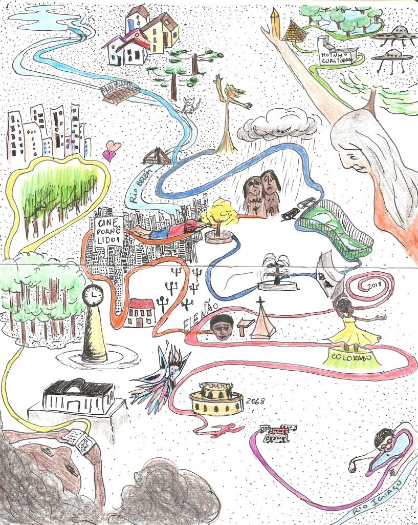 Os “percursos” desta temporada de agora foram criados em 2017 e 2018. Claro, que já passaram por modificações, alterações e ganharam novos elementos desde então. As histórias que aqui são contadas, cartografam com as palavras as muitas Curitibas experienciadas por essas personagens que as habitam. Me interessa contar as histórias marginais, invisibilizadas, não oficiais, não heroicas do Estado ou da nação, aquelas que falam dos seres, coisas, lugares e que constituem o ordinário tornando-o extraordinário. O que se narra aqui é constantemente nutrido pelo que está acontecendo ao nosso redor. Assim como duas personagens criadas por mim, a Gilda e a Maria Poeta, que capturam a experiência da vida com suas piscadas de olho ou escritas caminhante: é pedalando que conto grafando no percurso, com o corpo vivo, as muitas histórias que ali podem coexistir. Convido você a estar e participar dessa experiência para ver, rever, desver, transver com uma escuta atenta a paisagem que compomos com os nossos afetos nas complex(cidades).