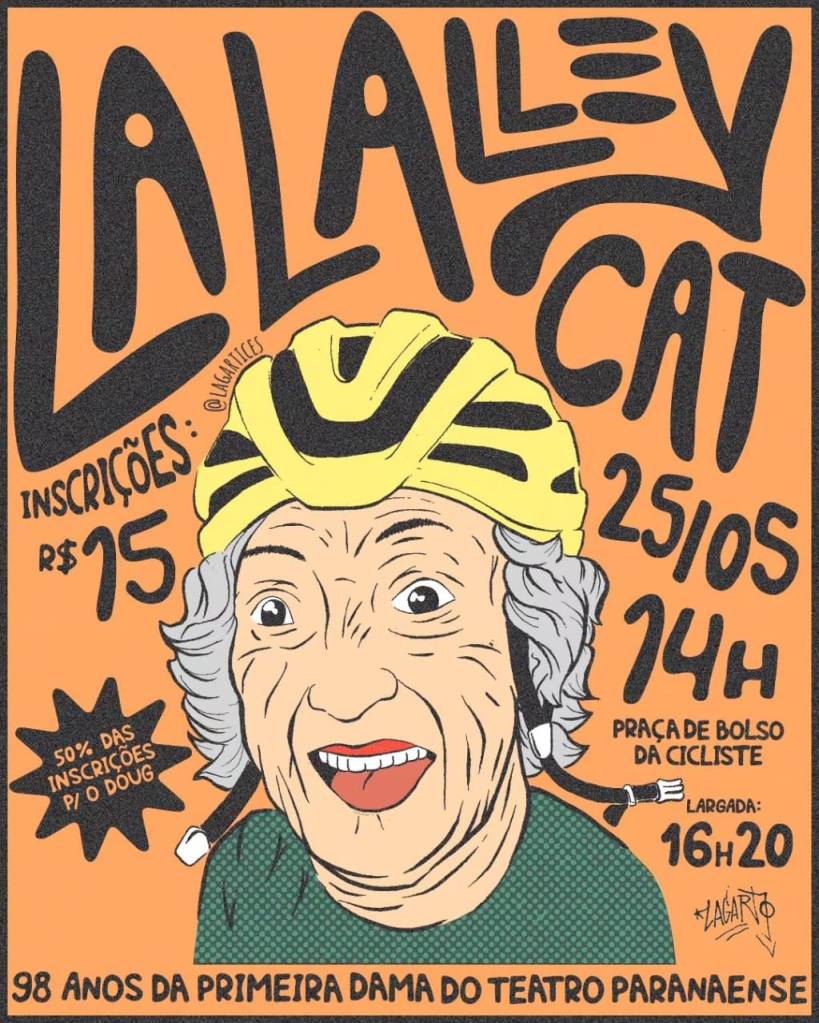 No dia 25 de maio de 2024 teve o AlleyCat em homenagem aos 98 anos da atriz Lala Schneider em Curitiba. Além da competição em si, outras atividades marcaram aquele sábado, e uma delas foi o Percursos Afetivos que também foi em tributo à Primeira Dama do Teatro Paranaense. Ao longo de quase 8 km percorremos as ruas do centro e dos bairros São Francisco e Prado Velho, em que narrei algumas das memórias sobre a Lala Schneider, transbordando sua biografia para outras artistas femininas da cena paranaense, reconhecendo suas importâncias. Falar sobre uma artista mulher, é também marcar o compromisso do projeto de tirar o véu do apagamento e negligência diante da constante opressão e violência sofridos por grupos sociais. Reconhecer o trabalho de uma artista da grandeza de Lala, é consequentemente, seguir com o reconhecimento do labor de muitas outras atrizes e trabalhadoras da cena do Paraná.